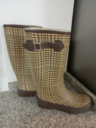 Botas de agua altas con un diseño elegante y detalles únicos. - Parte superior de tweed con motas blancas. - Detalle de hebilla dorada en la parte superior. - Suela de goma resistente.