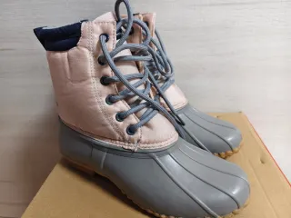 Botas de agua con un diseño moderno y práctico. - Parte superior en tela acolchada rosa. - Suela de goma gris. - Cordones grises para un ajuste seguro. - Forro interior azul marino. - Compradas en Nueva York, cómodas, no regalan. Geniales para agua y poca nieve. Usadas 2 veces