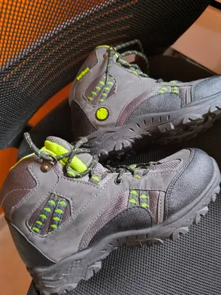 Botas de montaña en buen estado. - Combinación de colores gris y amarillo. - Diseño de caña alta.