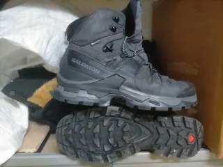 Botas de montaña Salomon en color negro y gris. Perfectas para senderismo y actividades al aire libre. - Diseño robusto y duradero. - Cierre con cordones. Se han usado solo 1 vez. Se venden porque me van pequeñas. Yo hago un 47 y 1/2 pero me están pequeñas a pesar de ser un 48. Les falta la plantilla interior.