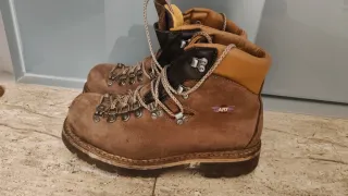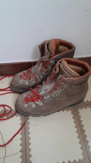 Botas de alta montaña de estilo antiguo. Perfectas para coleccionistas o para quienes buscan un calzado robusto con historia. - Fabricadas en ante marrón. - Cordones de color rojo. - Ojales metálicos para un atado seguro.