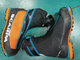 Botas rígidas Scarpa Phantom Tech en talla 44. Diseñadas para alpinismo y actividades en montaña. - Color principal negro con detalles naranjas y azules. - Cierre con cremallera. - Suela de goma con buen agarre. No le veo más rotos que los que salen las fotos , cremallera y cordones en perfecto estado , plantillas también.