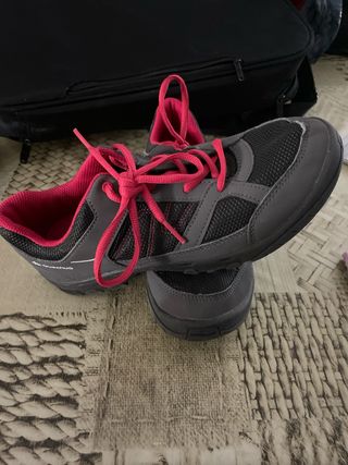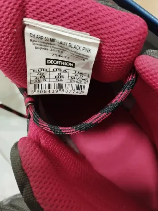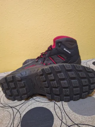 Botas de montaña de Decathlon en color rosa, talla 39. Perfectas para senderismo y actividades al aire libre. - Cierre con cordones. - Caña media para mayor sujeción. - Suela de goma para buen agarre.
