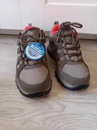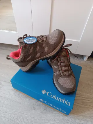 Zapatillas de montaña Columbia para mujer, ideales para senderismo y actividades al aire libre. - Tecnología OutDry impermeable. - Suela Techlite para mayor comodidad y amortiguación. - Diseño en azul y rosa.
