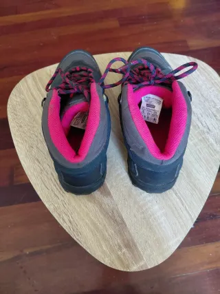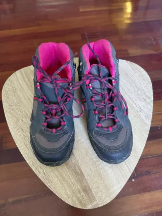 Botas de montaña para mujer, ideales para senderismo y actividades al aire libre. Poco uso en muy buen estado, como nuevas. - Cierre con cordones. - Detalle de color rosa en los cordones y tiradores. - Suela de goma. - Diseño de caña media.