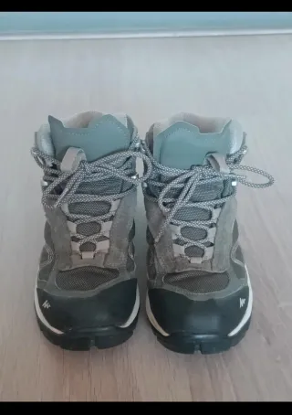 Botas de montaña Quechua en tonos grises y verde oliva. Perfectas para senderismo y actividades al aire libre. - Diseño robusto y duradero. - Cierre con cordones. - Suela antideslizante.