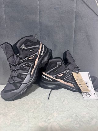 Botas de montaña Salomon nuevas, en perfecto estado. Cuentan con tecnología Gore-Tex para mantener tus pies secos. - Color gris y rosa. - Cierre con cordones. - Suela de goma adherente.