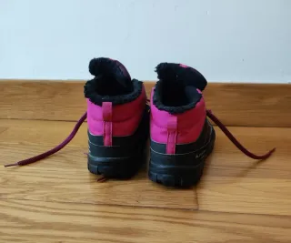 Botas de nieve Quechua para mujer, ideales para mantener los pies calientes y secos en la montaña. - Exterior de tela resistente. - Forro interior cálido. - Cordones morados para un ajuste seguro. - Suela de goma antideslizante.