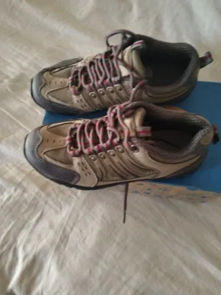 Zapatillas de montaña Quechua para mujer, ideales para senderismo y actividades al aire libre. - Nuevas sin usar - Diseño en tonos grises y detalles en azul. - Materiales resistentes y cómodos. - Suela con buen agarre. - Cierre de cordones.