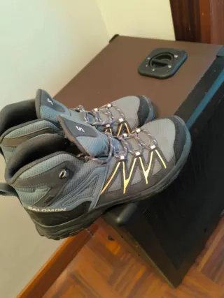 Botas de montaña Salomon con poco uso y en muy buen estado. - Diseño de caña media. - Cordones de ajuste. - Suela de goma. - Detalles en amarillo.
