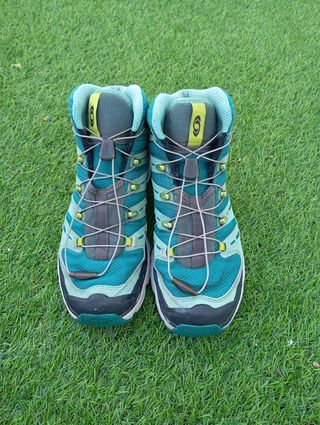 Botas de montaña Salomon en tonos turquesa y azulados. Perfectas para senderismo y actividades al aire libre. Estan en muy buen estado y són impermeables. Botas trekking - Diseño de caña media para mayor sujeción. - Sistema de cordones rápido y seguro. - Suela con buen agarre.
