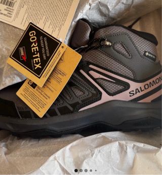 Zapatillas de montaña Salomon impermeables, ideales para trekking. Precio en tienda 159€, no las puedo devolver porque perdí el ticket - Diseño en tonos grises con detalles en rosa. - Tecnología Gore-Tex para máxima protección. - Cierre con cordones. - Caña alta para mayor sujeción.