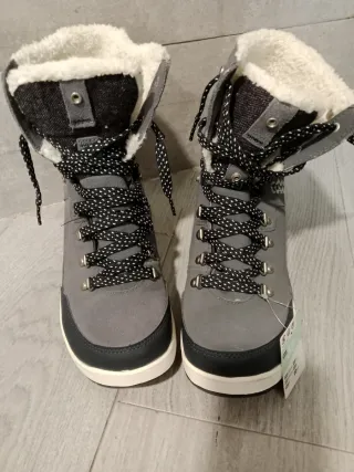 Botas de montaña con un diseño moderno y funcional. - Exterior en ante sintético gris. - Detalle de tejido técnico en la caña. - Forro interior cálido y suave. - Cordones negros con puntos blancos. - Suela de goma antideslizante. Muy calentitas y comodas