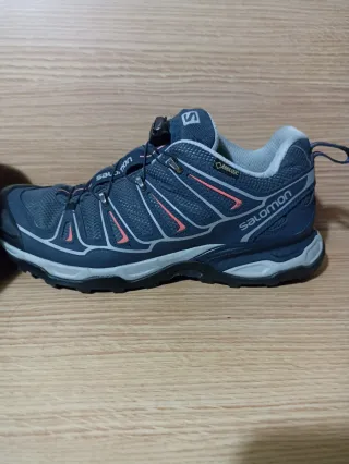 Zapatillas de montaña Salomon en tonos azules y grises. Perfectas para senderismo y actividades al aire libre. - Diseño deportivo y funcional. - Cierre con cordones. - Detalle de logo en el lateral.