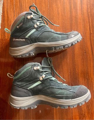 Botas de montaña Quechua en tonos grises y azules. Perfectas para senderismo. - Diseño de caña media. - Cierre con cordones. - Suela de goma. - Detalle de tirador en la lengüeta.