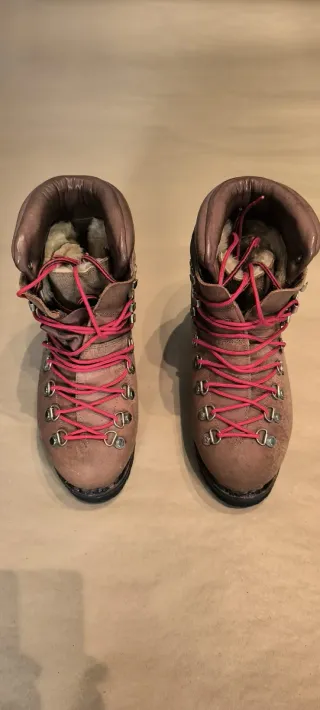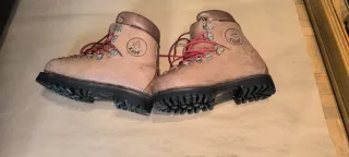 Botas de montaña de cuero en tonos marrones con detalles en rojo. Perfectas para senderismo y actividades al aire libre. - Cierre con cordones. - Suela de goma con buen agarre. - Diseño robusto y duradero.