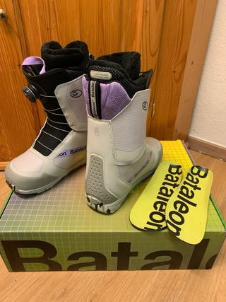 PRECIO NO NEGOCIABLE. Costaron 350€. Compradas a finales de 2024.Usadas una temporada. Nivel avanzado.Flex medio.Estilo all mountain. Características Cordón Boa®️ de doble zona con tecnología Coiler™️ Cordones exclusivos Burton New England con garantía Boa Lengüeta 1:1 PowerUP con flex medio Construcción Total Comfort, lengüeta de la bota con protección contra la nieve Forro Imprint™️ 2, aislamiento 3M™️ Thinsulate™️. Caña con cierre interno para una mayor sujeción del talón Cierre con velcro Forro polar Gel B3 La mediasuela optimizada EST®️ contiene caucho reciclado Tecnología Shrinkage™️ para reducir el espacio ocupado