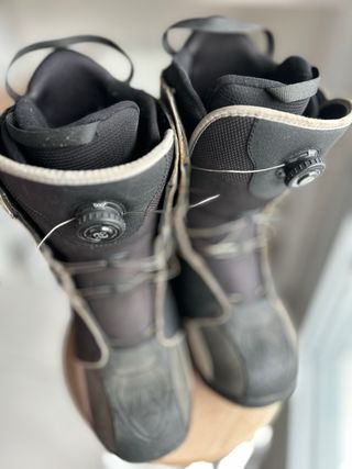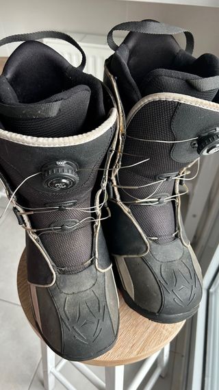 Botas de snowboard Deeluxe, usadas 5 dias de temporada pasada, son comodas pero me son pequeñas, en color beige y negro. Diseñadas para ofrecer comodidad y rendimiento en la montaña. - Cierre con velcro y hebillas. - Interior acolchado para mayor confort. - Suela de goma para un buen agarre.