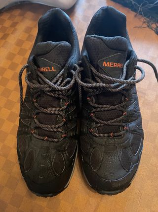 Zapatillas de montaña Merrell Accentor 3 Sport GTX en color negro con detalles en naranja, usadas dos veces, estan en perfecto estado, ver ultima foto ligeros roces, concretamente por quitarle una tela q suelen llevar atras como para colgarlas. Precio en la pagina oficial de merrell 155 podeis ver ahi las caracteristicas. - Diseño deportivo y resistente. - Cierre con cordones. - Suela con buen agarre. Salomon, sportiva, goretex, waterproof, trek, trekking, montaña, invierno, monte, nieve, montaña