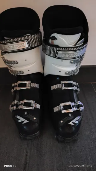 Botas de esquí de la marca Tecnica, combinando blanco y negro. - Cierre con hebillas metálicas. - Correa de velcro superior. - Interior forrado en negro.