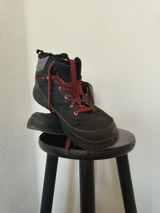 Botas de nieve Quechua en color negro con detalles en rojo. Perfectas para mantener tus pies calientes y secos. Los he usado 2 veces solamente y suelen costar 50 - Cierre con cordones. - Caña alta para mayor protección. - Suela antideslizante.