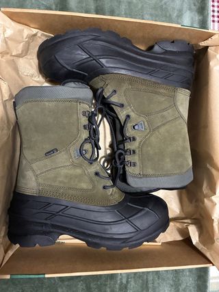 Botas Kamik Nation Plus diseñadas para el frío extremo. Compradas para un viaje a Laponia y finalmente usadas un solo día de ruta (a -25 grados y perfectas). Están NUEVAS Características: - Color verde y negro. - Material exterior de cuero y goma. - Botin interior termico - Cierre de cordones.