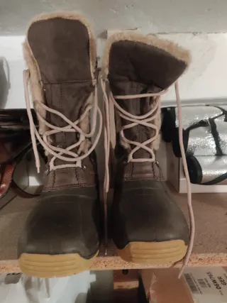 Botas de nieve con un diseño práctico y abrigado. - Exterior en tonos marrones y detalles beige. - Forro interior suave para mayor calidez. - Cierre de cordones para un ajuste seguro. Usadas en una ocasión solamente