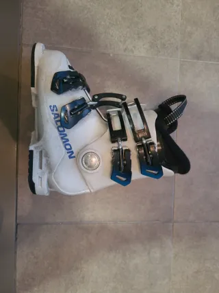 Bota de esquí para niño de la marca Salomon. Talla 20-20.5 246mm. Corresponde a 32 de pie aproximadamente. - Color blanco y azul. - Cierre con hebillas.