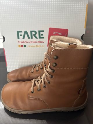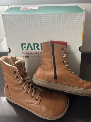 Fare Bare - Freya Winter Shoes Botas barefoot de invierno. Aptas para nieve Color mostaza. Talla 42. - Cierre con cordones y cremallera para mayor ajuste - Interior forrado para mayor calidez. - Suela de goma adherente. Zapatos de media caña Winter Strob, con cordones. La plantilla cosida (Strobe) proporciona mayor flexibilidad. Material exterior: piel de vacuno plena flor natural y lisa. El forro es de invierno con un cálido pelo de longitud media Plantilla de lana MERINO. La suela es de caucho termosellado #barefoot #barefootshoes Una puesta. Tengo otras negras