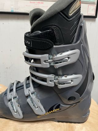 Botas de ski de la marca Salomon en color gris. Diseñadas para ofrecer comodidad y rendimiento en la nieve. - Cierre con hebillas ajustables. - Diseño ergonómico para un buen ajuste. - Materiales resistentes para mayor durabilidad.