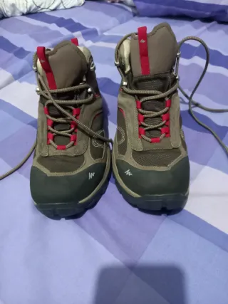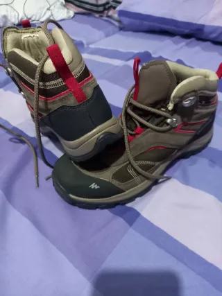 Botas de montaña Quechua en tonos marrones con detalles en rojo. Perfectas para senderismo y actividades al aire libre. - Diseño robusto y cómodo. - Cierre con cordones. - Suela antideslizante.
