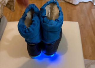 Botas de nieve para niña en talla 25/26. Perfectas para mantener los pies calientes y secos en los días fríos. (Un solo uso practicamente a estrenar) - Parte superior azul. - Suela de color verde oliva con luces