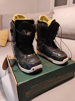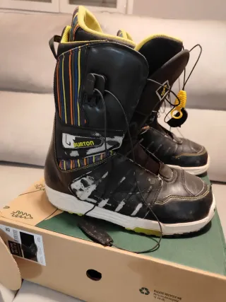 Botas de snowboard Burton Moto en color negro y amarillo. Diseñadas para ofrecer comodidad y rendimiento en la montaña. - Cierre rápido. - Suela de goma. - Interior acolchado. Están bastante usadas y sobretodo en la bota derecha se aprecian bastantes signos de desgaste. Aún así no dejan de ser un botón para practicar snowboard y por este precio para comenzar o si subes poco, son tus botas. Talla 44 en calzado de calle llevo normalmente un 43. Precio negociable.