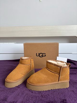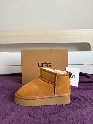 Botas UGG Classic Ultra Mini en color beige y marrón. - Diseño clásico y cómodo. - Forro interior de lana. - Suela plataforma.