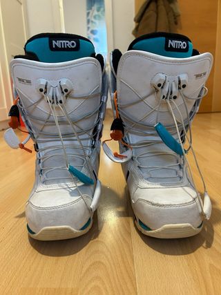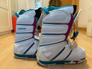 Botas de snowboard Nitro Crown TLS para mujer, con muy poco uso. - Modelo crown - Sistema TLS (doble ajuste) - Tallan pequeño Las botas se han llevado solamente un par de veces y están en buen estado. La suela esta casi sin desgaste a pasar de algun que otro rasguño. Cierres y cordones en perfecto estado. Deje de usarlas ya que estuve varios años sin subir a la nieve y se me quedaron pequeñas. ⚠️Tallan pequeño yo suelo llevar una 37 y estas siendo 38 me van bastante justas