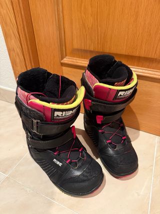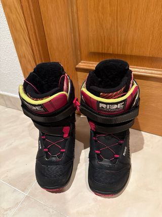 Botas de snowboard de la marca Ride en color negro con detalles en rosa y amarillo. - Cierre con velcro y cordones. - Interior forrado para mayor comodidad. - Diseño deportivo y llamativo.