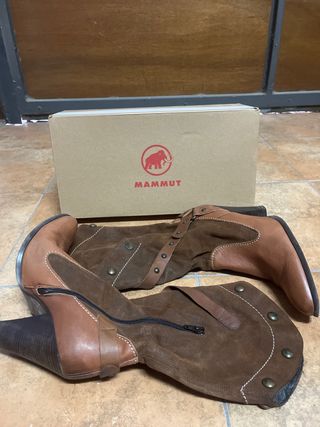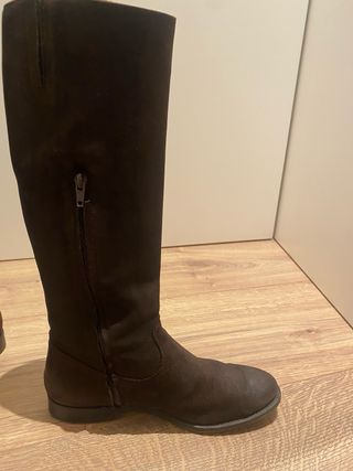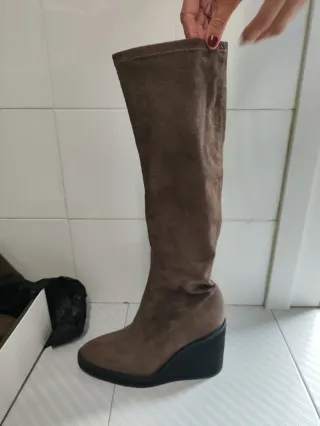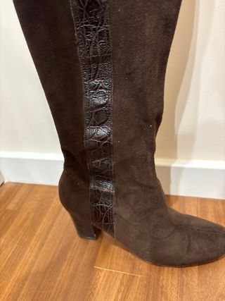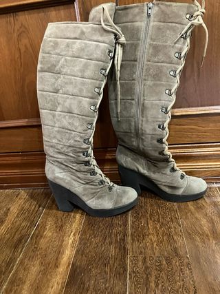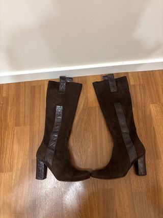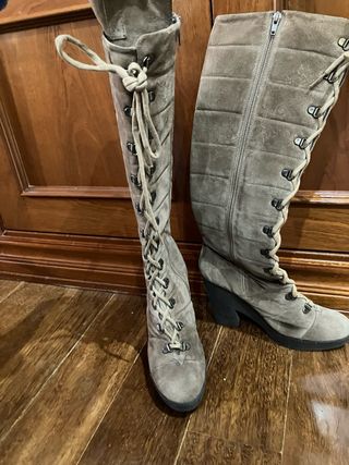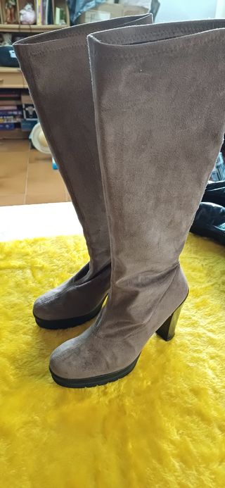 Botas altas de ante en color topo. - Diseño con caña doblada. - Tacón de bloque con textura. - Material de ante suave. Las vendo porque eran de mi madre y las estaba guardando para alguna ocasión especial y ya no las quiere usar. Abierta a negociaciones razonables.