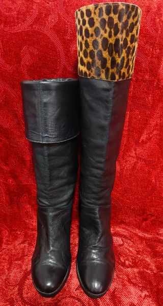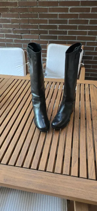 Elegantes Botas negras de piel Farrutx Medidas: Número 37,5 - 09 Alto desde suelo 41 cm. Tacón 3,5 cm Ancho de boca 17,5 cm Lleva un pliegue de 8 cm para poder adaptarla. Son botas tanto para sport como un poco más elegante.