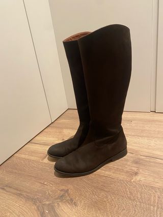 Botas altas planas de la marca Farrutx. Totalmente nuevas sin ningún uso. Las compré en un outlet por 79 euros (costaban más de 200). La talla es 41 aunque son un poco grandes. La medida interior es 27 cm. Están catalogadas como bota alta mujer pero también sirven para hombre.