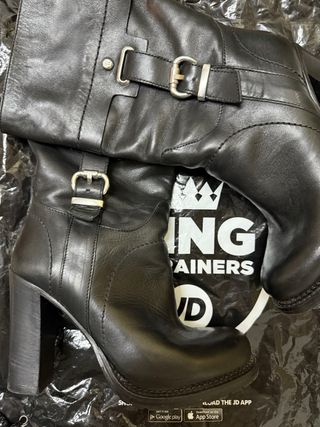 Botas de mujer de tacón alto, color negro. Son de cuero y tienen un diseño elegante. - Son dos botas. - Tienen un tacón grueso y alto. - El cuero se ve en buen estado. - Diseño con hebilla.