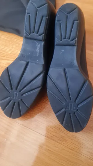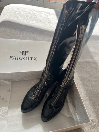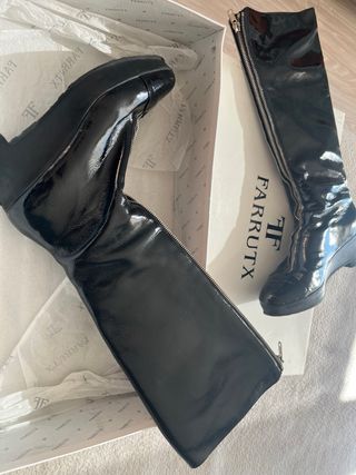Botas altas de charol de la marca Farrutx. Son de color negro y tienen un diseño elegante. - Cremallera doble en la parte delantera. - Puntera fina. - Tacón bajo. Farrutx talla justo así que mejor para 36-36.5 Puestas muchas veces, tapas recién puestas