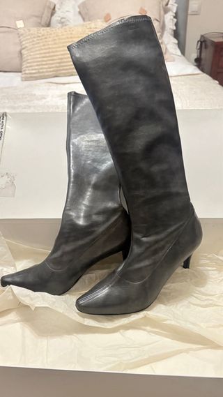 Preciosas botas altas de piel en muy buen estado, con tacón alto y cierre de cremallera. Aunque parecen de color negro es Berenjena, el color es precioso. Cierre de cremallera frontal.- Puntera ligeramente redondeada.