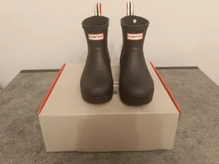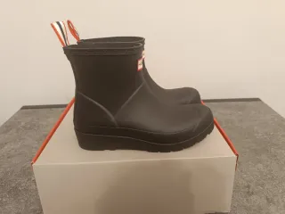 Botas de agua de la marca Hunter, talla 37, a estrenar. - Diseño corto y práctico. - Tirador trasero con detalles de rayas.