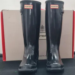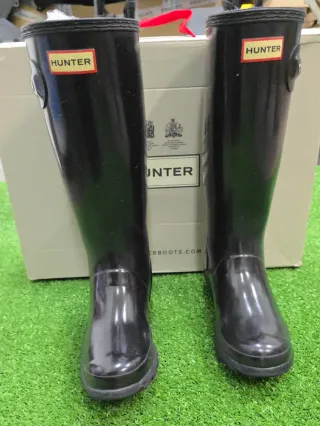 Botas de agua HUNTER originales, color negro. Están en buen estado. Solo tiene un defecto: en la etiqueta frontal de una de ellas (la bota izquierda), una rozadura (como se ve en las fotos) Número 36