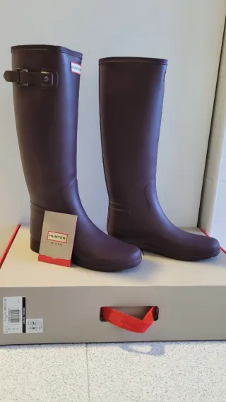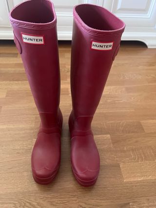 Botas de agua marca Hunter en color corinto, talla 38. Vienen con sus etiquetas originales. - Modelo clásico de caña alta. - Acabado brillante. - Suela con buen agarre.
