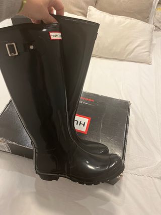 Botas de agua altas de la marca Hunter en color negro. - Diseño clásico. - Hebilla lateral ajustable. Con apenas 3 puestas. Me las regalaron y se confundieron en la talla.