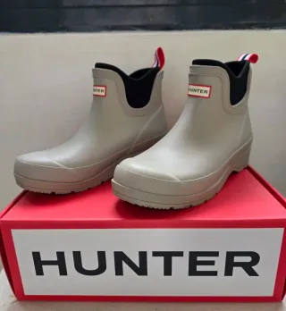Botas marca Hunter color beige nunca puestas Talla 6 UK = 39 / 39,5 EU - Diseño tipo caña media. - Tirador trasero para facilitar su colocación. - Banda elástica lateral.