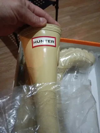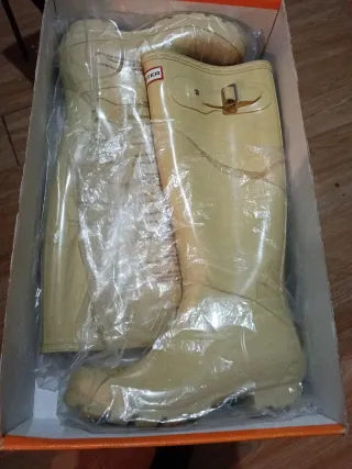 Botas de agua altas de la marca Hunter en color beige. Perfectas para días lluviosos o actividades al aire libre. - Diseño clásico. - Hebilla decorativa en el lateral. Posibilidad rebaja