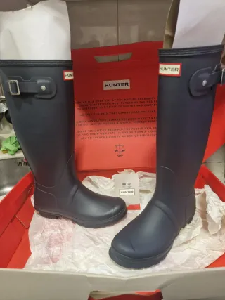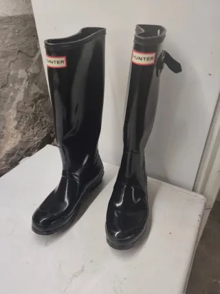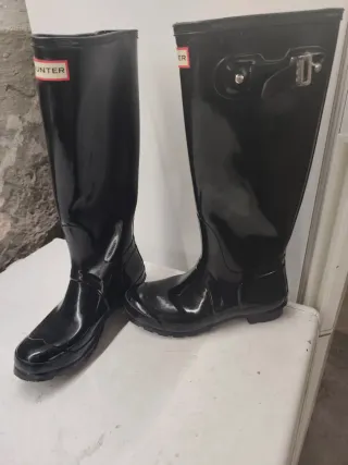 Botas de agua altas de la marca Hunter en color negro. Perfectas para días lluviosos o actividades al aire libre. - Modelo clásico de caña alta. - Acabado brillante. - Detalle de hebilla ajustable en el lateral. Nuevas sin estrenar ni para probarlas por eso las vendo porque no las probé y no las puedo devolver me costaron 149,99€