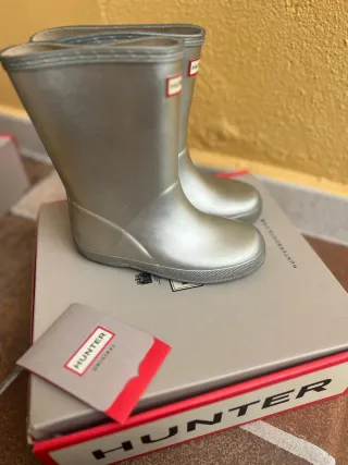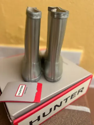 Botas de agua para niña de la marca Hunter. - Color plateado brillante. - Diseño clásico de caña alta. - Incluye etiqueta original.
